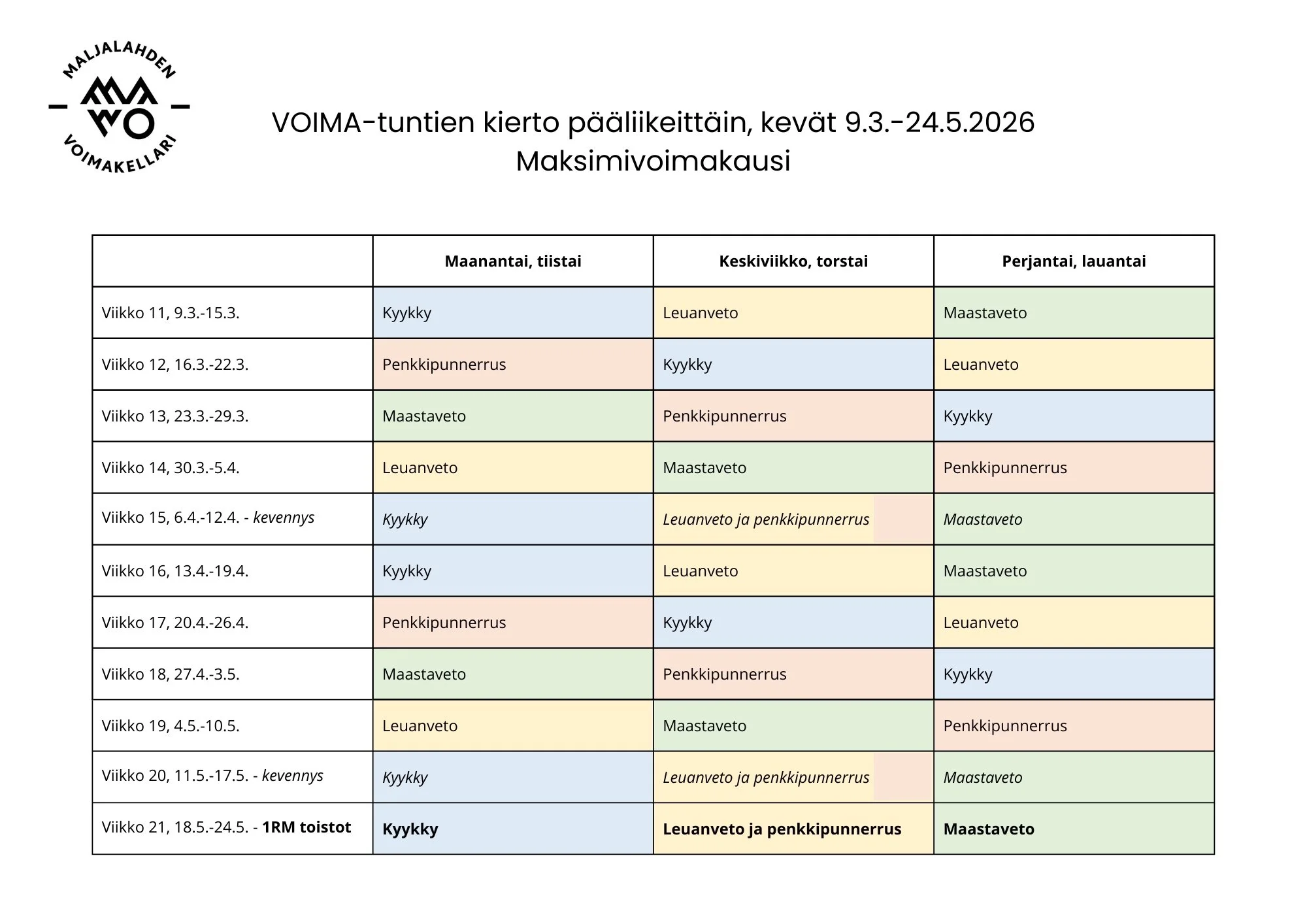 Kevään ensimmäinen sykli ohjelmoinnissa kesti 8 viikkoa, jonka aikana keskityimme perusvoimaan ja isoihin, kehoa monipuolisesti kuormittaviin liikkeisiin. Nyt siirrymme jälleen enemmän maksimivoiman pariin ja toukokuun lopussa testaamme yhden toiston maksiminostoja pääliikkeissämme. Kevään ohjelmointi kestää 21 viikkoa eli 5.1.-24.5. välisen ajan.